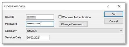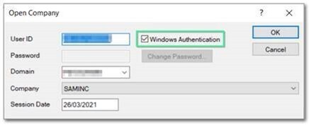 Sage 300 users can be allowed to either log in automatically, provided they are already logged in to their computer with their Windows password (this is called Windows Authentication), or log in with a specific Sage 300 username and password (this is called Sage 300 Authentication).